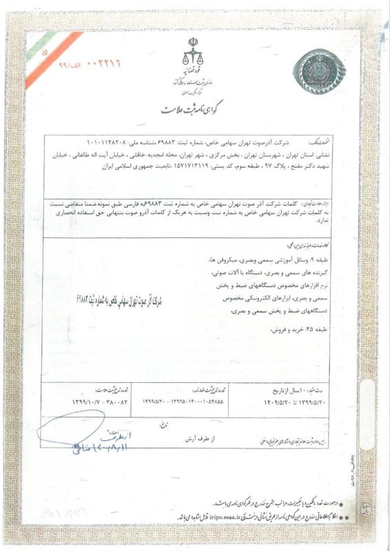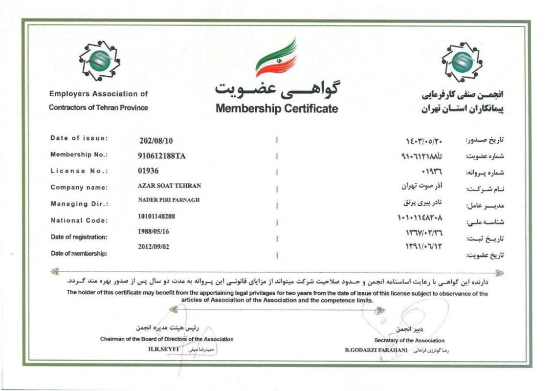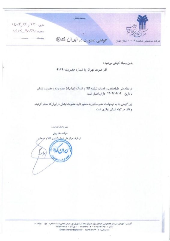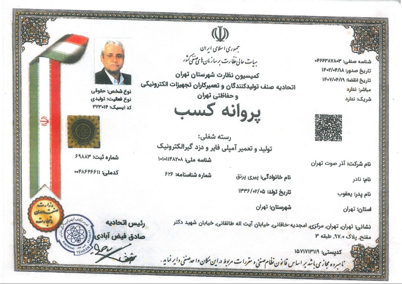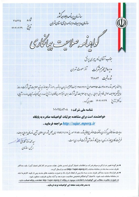 در دنیای پر رقابت امروز، اعتماد و اطمینان سنگ بنای هر همکاری موفق و پایدار است. ما در شرکت آذر صوت تهران، بر این باوریم که ارائه خدمات و محصولاتی با بالاترین کیفیت، تنها در سایه تعهد بیوقفه به اصول اخلاقی و استانداردهای حرفهای میسر میشود. از همین روست که با افتخار اعلام میکنیم، هر گام از فعالیتهای ما با رعایت دقیقترین موازین و اخذ معتبرترین گواهینامهها و مجوزها همراه بوده است.