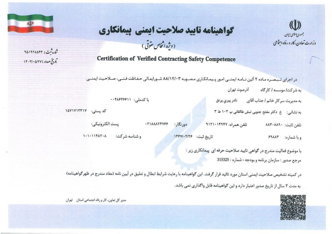 این گواهینامهها و مجوزها صرفاً مجموعهای از مدارک نیستند؛ آنها تجلیگر پایبندی بیقید و شرط ما به اصول کیفی، رعایت ضوابط قانونی و تلاش مستمر برای ارتقاء سطح عملکرد هستند. هر کدام از این مدارک، سندی معتبر بر دانش، مهارت و رویکرد مسئولانه ما در قبال شما، مشتریان گرامی و شرکای تجاریمان به شمار میروند. اینها نه تنها مهر تأییدی بر اعتبار ما هستند، بلکه تضمینی قاطع برای ارائه بهترین خدمات و محصولات به شما محسوب میشوند.